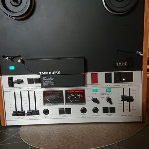 Tandberg spolebåndopptager 3500X. Kjøpt i siste halvdel av 1970-årene, en eier. Har stått ubrukt på tørt lager i de siste ca 30 år. Når jeg nå tar den frem igjen så spiller den av som "i gamle dager" men om det er maskineriet som trenger noe rens/smøring, eller om det er de gamle spolebåndene som har klistret seg litt sammen i årenes løp (eller en kombinasjon) så går avspillingen noe tregere og det høres tydelig pipelyd fra båndene.. Har aldri hatt den på service/rep./rens. Den har palisander trepanel på sidene. og det medfølger original DIN-kabel og tomspole.