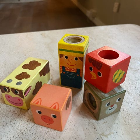 Stabletårn i plast med fine mønster, figurer og flyttbare elementer. Kule som kan kastes gjennom tårnet.