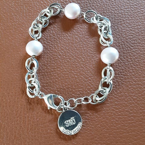 Jeg selger et armbånd som er sølvbelagt oppå stål med hjerte charms. Det er 20 cm langg og 5 mm bredt.