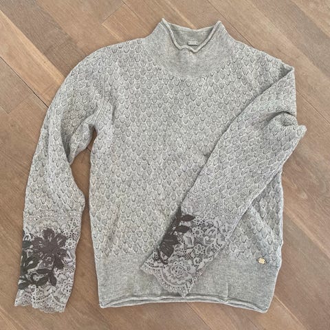 Nydelig genser med fine detaljer o halsen og 3/4 erme i ullmix i en nydelig dyp rosa farge i str 38 kun brukt noen få ganger. Ny pris ca 2000