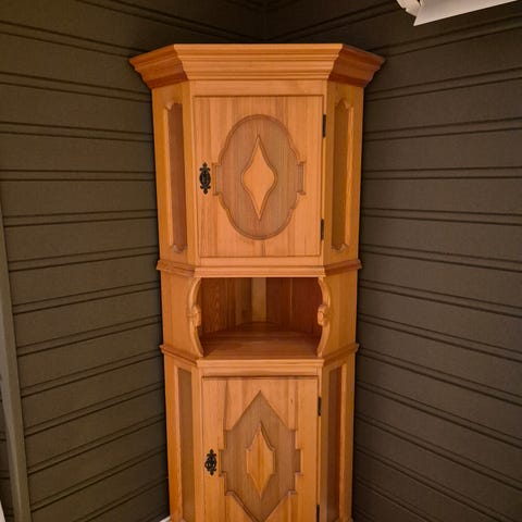 Knag hjørneskap i tre, høyde 158 cm. Dybde 70 cm.