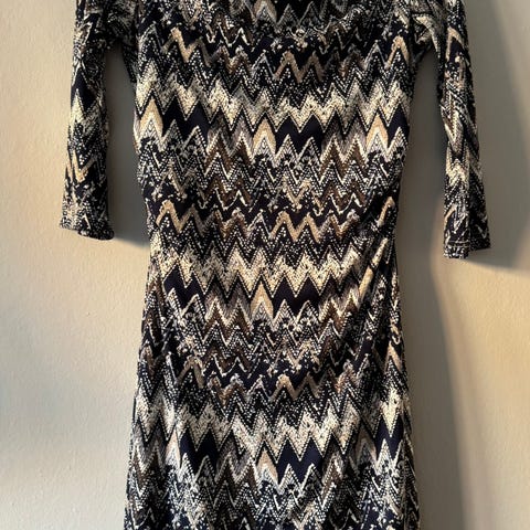 Tiger of Sweden minikjole med flerfarget mønster i gråsort/offwhite/beige. Kjolen har båthals foran og v-utringning på ryggen. Det er en lekker drapering som går fra skuldrene til livet som gir et feminint uttrykk og timeglassfigur. Kjolen er i myk viskose, er fóret og utrolig behagelig å ha på. Vil passe deg som er str. 34/36 eller XS/S.