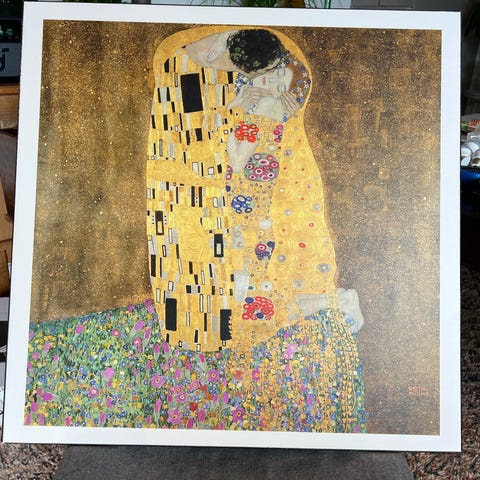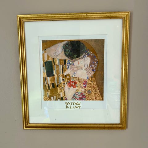 Gustav Klimt (1862–1918) var en prominent østerriksk symbolistisk maler og en av de mest fremtredende medlemmene av Wiener Secession-bevegelsen. Han er kjent for sine sensuelle og rike verk, ofte preget av gullfarger, intrikate mønstre og symbolisme. Kysset" (originaltittel: "Der Kuss") er utvilsomt Gustav Klimts mest berømte maleri og et ikonisk verk fra hans "gullperiode", som varte fra 1907 til 1908. Bildet fremstiller et par som omfavner hverandre i det som ser ut til å være et evig kyss, omgitt av en glitrende kappe av gull og intrikate ornamenter.