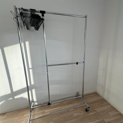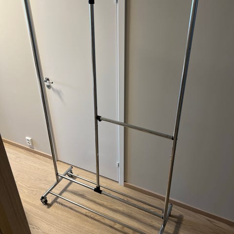 Justerbart klesstativ som står på hjul, enkelt å flytte rundt. Kan henge både lange og korte klær på det, og du justerer enkelt hvor mye plass du vil ha til langt/kort oppheng. I fin stand og hentes demontert. Enkel montering.