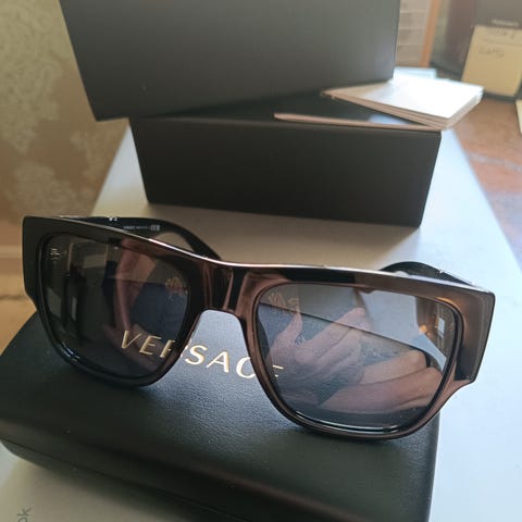 Armani solbriller for unisex med brun fargetone. Brillene har en moderne, kantet og smalt design uten ramme rundt glassene. Leveres med et sort etui med Armani-logo. Brillene er utsolgt og fåes ikke tak i lengre.
