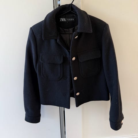 Jakken går til livet, litt vid nede, gullknapper. Utsolgt fra Zara.