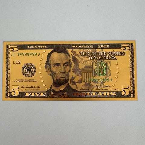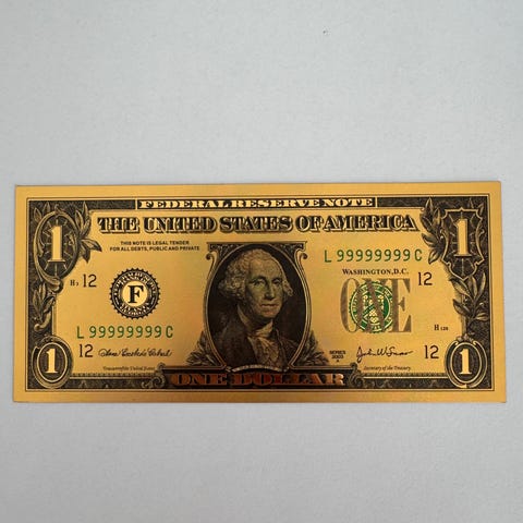 Knall tøff, Gull Forgylt Amerikansk seddel. Den er helt som ny og har vert innrammet. Det anbefales og ha den i en transparent ramme, da den er like dekorativ fra begge sider.