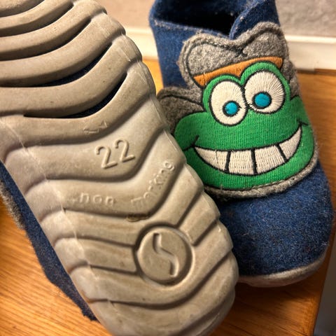 Superfit barne tøfler i størrelse 22, unisex design. Tøflene er laget av lys grønt ullfilt med hvit såle. De har en myk og varm konstruksjon som passer for innendørs bruk. Tøflene har en borrelås for enkel justering og påsetting. Dekorative applikasjoner foran i form av små dyr.