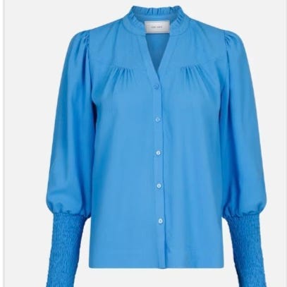 Utrolig fin bluse med flotte detaljer, ermer med rysjer og bølgete knappestolpe.