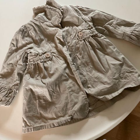 Kjempesøt, offwhite eller beige Name it jakke/kåpe/trenchcoat, størrelse 128 og str 140. (Vi har to av denne). Jakken har avtagbar hette, blomstret fór og dekorerte knapper. Den har vaffelsøm i livet og er utsvinget. Stoff i bomull og polyester. Pent og lite brukt, fin til bursdager og i ny og ne om våren/sommeren/høsten.