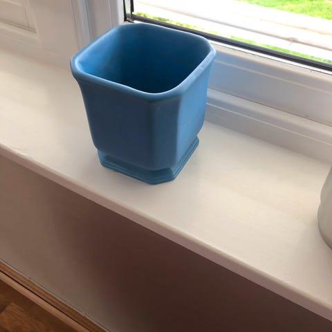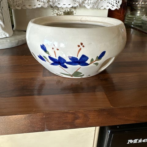 Dekor med blå og gule blomster med grønn bakgrunn. Diameter øverst er 16 cm. Omkrets er 54 cm.