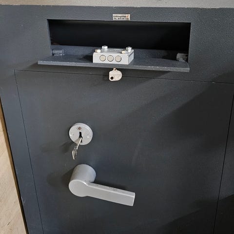 Har tidligere vært brukt til nattsafe i bank. Er behelpelig med pålasting.