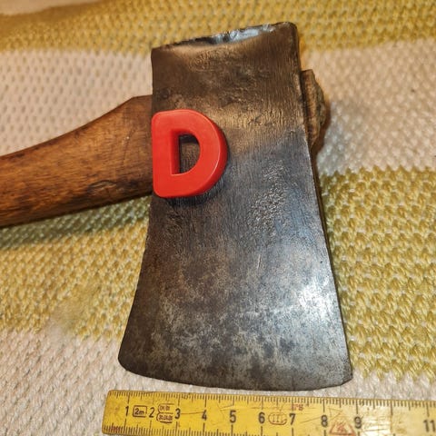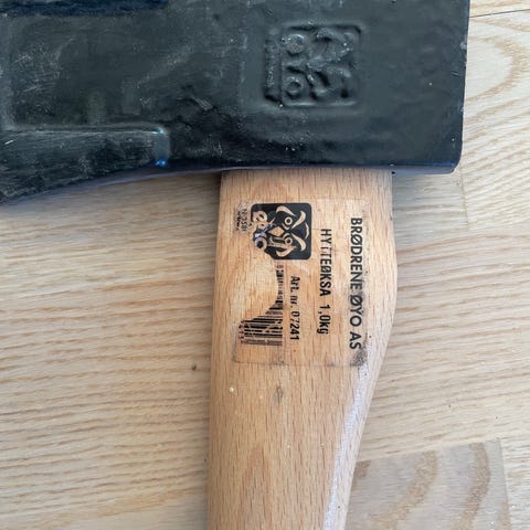 Thor øks, klistremerke med tekst: skarpslipt helstål. Svensk kvalitetsstål. Skjelden bra stand.