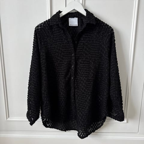 & Other Stories bluse i størrelse XL, beige farge. Laget av lett og semitransparent materiale. Har høy hals med knappelukking bak, lange ermer med mansjetter og knappelukking.
