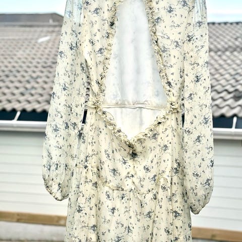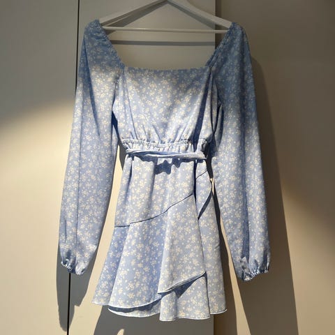 Selger et todelt sett i lett og behagelig stoff med blomsterprint på hvit bunn. Settet består av en voluminøs skjørt/kjole-del og en matchende topp med lange ermer og omslagseffekt. Kan brukes både sammen som en kjole, eller separat som skjørt og topp – perfekt for vår og sommer!