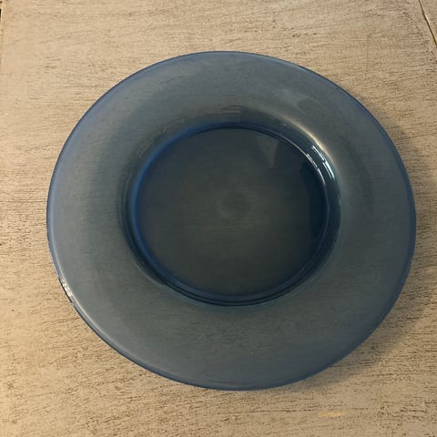 Fatet har en rund form og er egnet til dekorasjon eller servering. Materialet er glass, og fargen er grønn/blå med hvite detaljer.