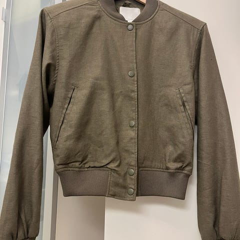 Selger en beige linmiks jakke med skulderputer fra H&M str M.