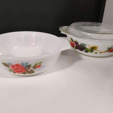 Retro sett med 5 ildfaste former. De 4 største har lokk og alle 5 er i utmerket stand.
