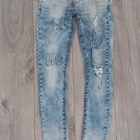 Supertøffe jeans kjøpt i Tyrkia, med lavt liv og masse strass selges kroner 200,-.