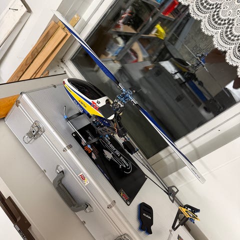 Helikopter 450 størrelse med Align servoer. BNF. Fløyet tre turer innendørs før oppgradering av servoer og mottaker. Ikke fløyet etter. 2 batteri + lader.