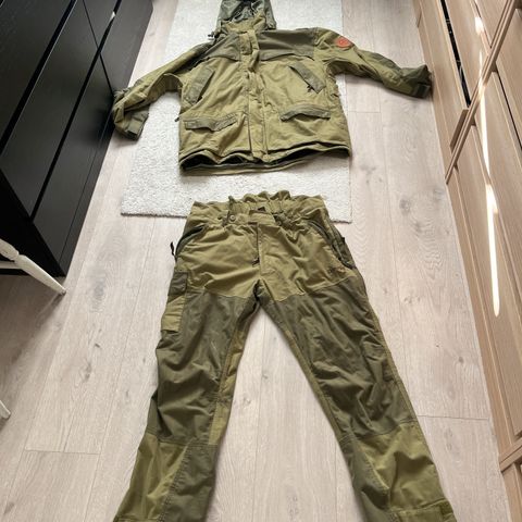 Dovrefjell jakke og 2 bukser for Dame i grønn farge. Jakken og buksene er laget av slitesterk bomull med forsterkede områder for økt holdbarhet. Jakken har flere lommer med glidelås og knapper, samt justerbar.