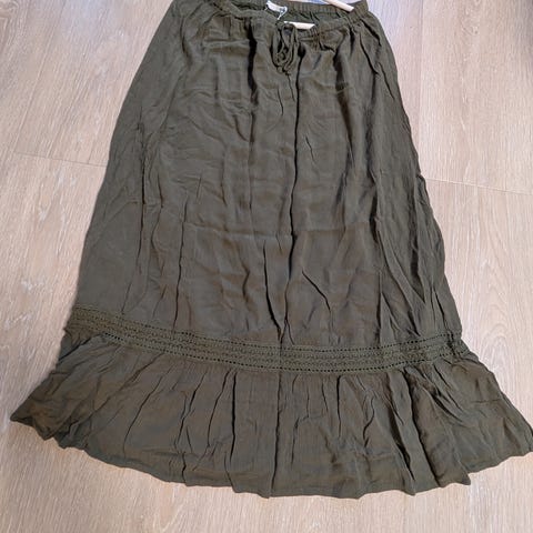 Selger et kjempefint og nesten ubrukt skjørt fra MSCH Copenhagen (Moss Copenhagen). Skjørtet har en elegant sateng-lignende finish, strikk i livet for god komfort, og en lekker blondedetalj nederst. Det har også en splitt på siden som gir det lille ekstra.