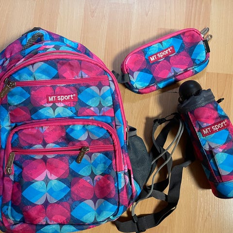 Denne ryggsekken og penalsettet er brukt, men i god stand, og er veldig komfortabelt å bruke; ryggsekken har mange lommer og reflekselementer; penalet lar å organisere skoleutstyret på en enkel måte.