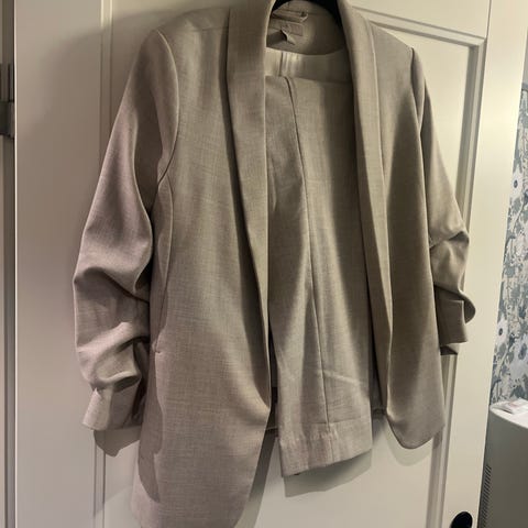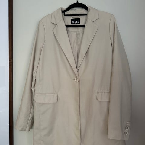Pieces Beige Blazer i størrelse L for kvinner. Jakken har en åpen front uten knapper og er laget i et lett materiale. Ermelengden er trekvart, og designet er enkelt og klassisk, egnet for både formelle og uformelle anledninger.
