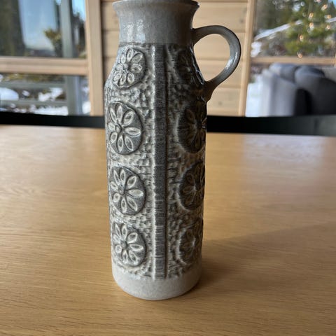 Stilfull liten vase i keramikk, godt håndverk med fint mønster. Høyde 13 cm, bredde 6 cm, dybde 6 cm. God stand.