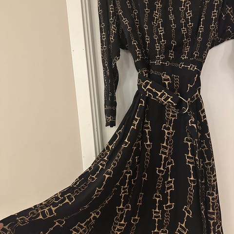 Massimo Dutti hverdagskjole i størrelse M, hvit farge med stripemønster. Kjolen har knapper foran og belte i livet. Laget for kvinner og egnet til daglig bruk.