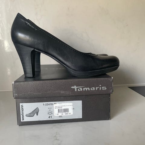 Tamaris sko med kilehæl i svart farge, størrelse 41. Materialet er syntetisk med justerbare stropper for god passform. Lite brukt.