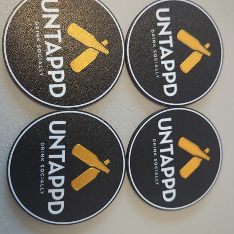 7 stk coasters inkl metallboks fra Jacobsen / Carlsberg. Svart gummi som ikke sklir. Rød skrift / logo