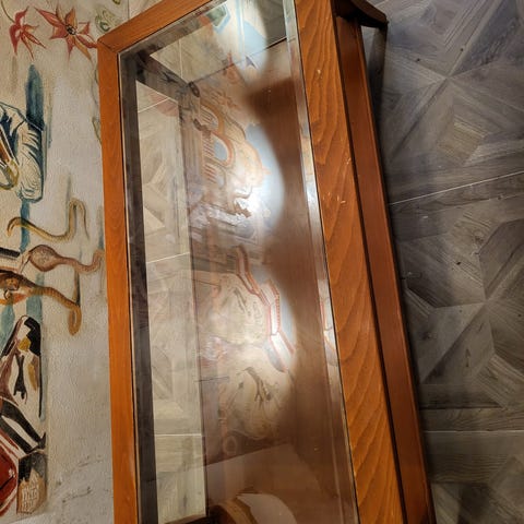 Fremstår svært. Hylle for oppbevaring i bunn og glassflate på toppen.