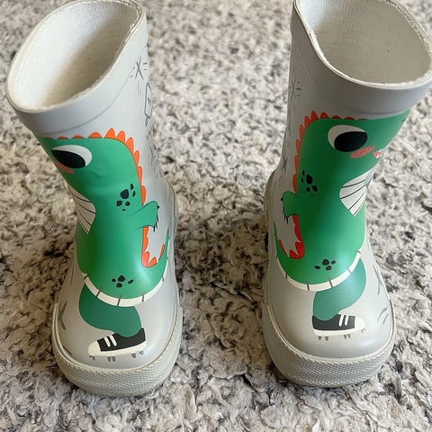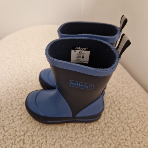 Regnstøvler str. 20. Et par blå gummistøvler fra Reflex. Disse støvlene er designet for regnværsdager og er beregnet på barn. De har en grå såle og overdel.