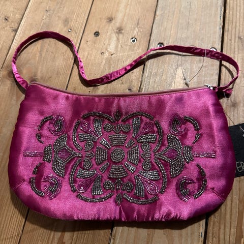 Elegant veske i rosa fløyel med vakre detaljer i midten, pyntet med perler og små glassperler. Vesken har en kort skulderreim i samme fløyel. Lukkes med glidelås og har god plass til det viktigste. Perfekt som selskapsveske eller et unikt vintage-inspirert tilbehør til antrekket. Se bilder for mål. 💗