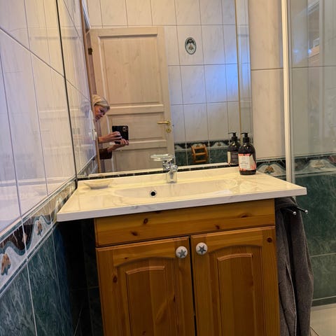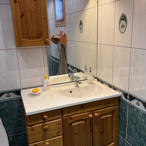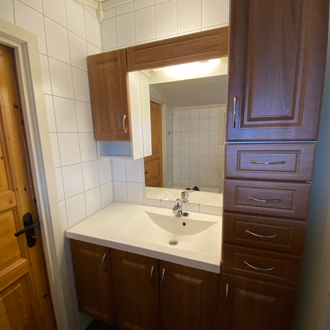 Baderomsinnredning med servant, inkludert underskap og overskap i hvit farge. Kr 1500.