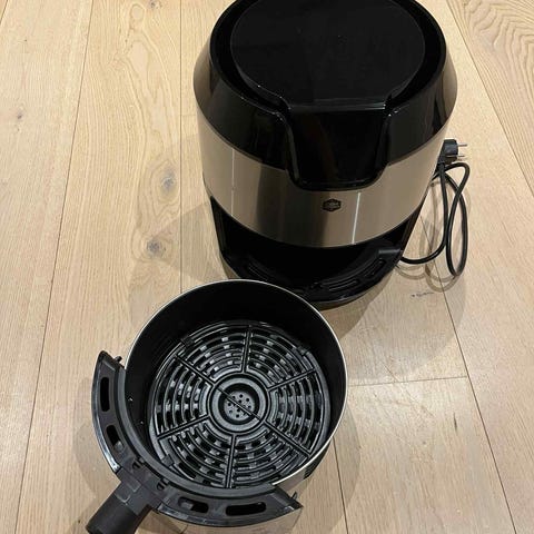OBH Nordica Airfryer i hvit farge med kapasitet til å frityrsteke mat ved hjelp av varmluft. Enheten har en avtakbar kurv og justerbare innstillinger for temperatur og tid. Designet for enkel rengjøring og bruk i hjemmet.
