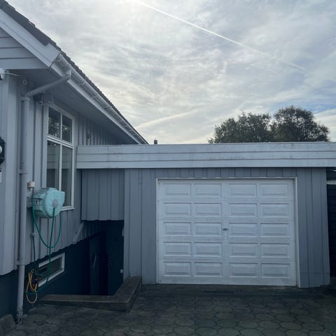 Hvitmalt skur med skyvedører gis bort. Må selv stå for demontering og henting. Inne i skuret er det to store limtredrager i god stand. Treverket er i god stand.