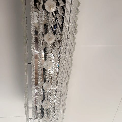 Hvitt glass ytterst og delvis frostet/ klar glass på innerskjerm. Messing oppheng.