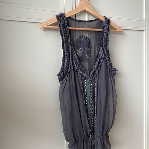 100% Silke tanktopp med Perle- og krystallutsmykning overalt toppen er Laget i India og er veldig skjelden, den kan godt brukes til alt mulig anledninger. Den har en nydelig farge med beige brun farge. Størrelse Large men best passer til medium. Pent brukt