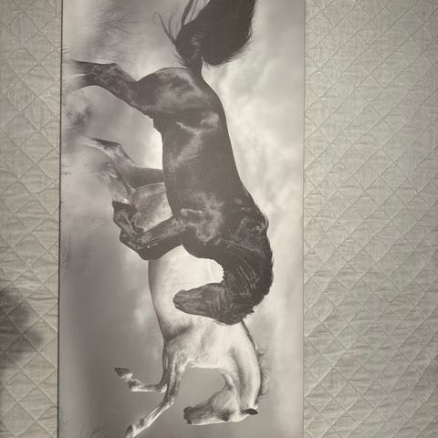Stort bilde av hest på lerret, kan hentes etter avtale.
