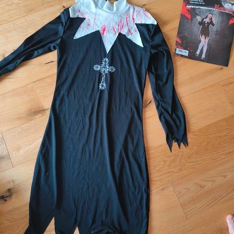 Ukjent dame kostyme i rød og svart farge med tilhørende svart hatt med rosa sløyfe. Kostymet har detaljer i glitrende stoff og blonder, og er designet for jente ca. 4 og 5 år. Passer til bruk ved kostymefester eller lignende anledninger.