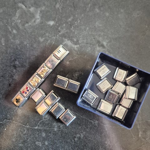 Ledd armbånd selges. Startpakke med 3 mønster ledd. Resten blanke. Sender mot porto.