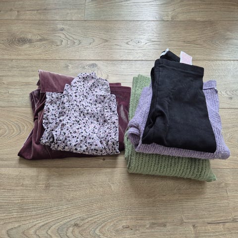 Klespakke til barn 9-10 år. Pakken består av 3 gensere, 2 bukser, 2 hettejakker og 1 t skjorte🥰alt for 200