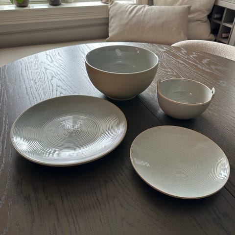 Søkeord: keramikk, porselen, retro, samleobjekt, skål, vintage, funkis, serveringsbollen, sausnebb, skål med fast asjett, til servering og bruk i kjøkkenet, utgått modell, karakteristisk riflet, med mønster, elegant og nett form, lucina serien,