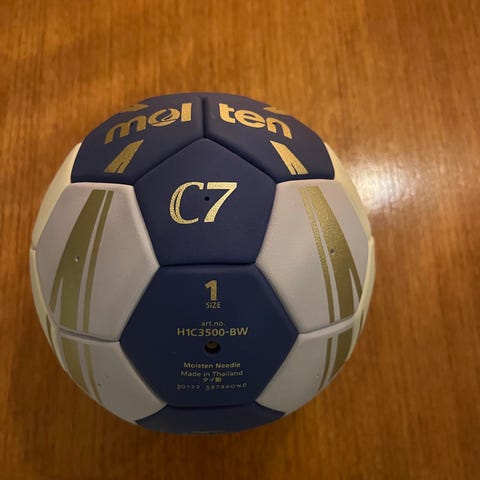 Molten C7 håndball i blå og hvit farge. Ballen er laget for håndballspill og har standardstørrelse. Den har et mønster med blå og hvite sekskanter og er merket med Molten-logo og IHF Original Match Ball.