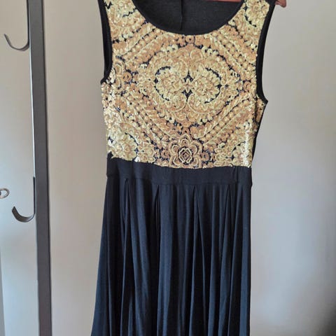 Selger en lekker gullkjole med gullpaljetter og gullstropper og som er v-formet foran med glidelås bak