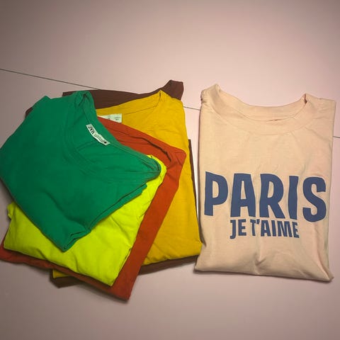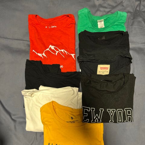 T-skjorter som ikke lengre blir brukt. Alt er i størrelse M unntatt den røde og den gule som er i str L. (Men vil si de er små i størrelsen og er brukt samtidig med de andre i M). Den hvite t-skjorten er i 55% viskose. Alt pent brukt.