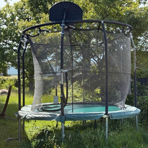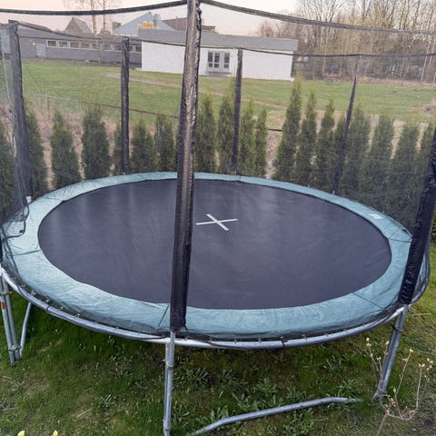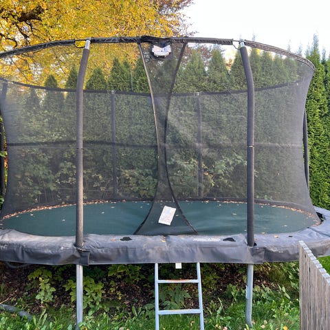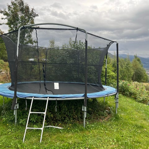 Mellomstor trampoline med knallsprett og plass til flere hoppere. Fortsatt mye bruk igjen. Noen av de sorte polstringene på stengene til nettet er litt ødelagt, så de er tapet med gaffateip.
