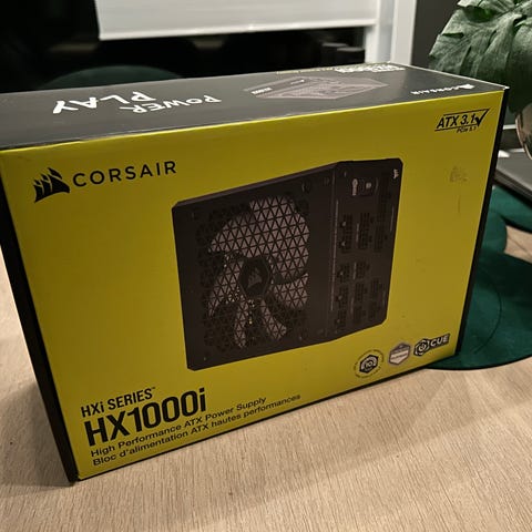 Corsair HX1000i Strømforsyning ATX med en effekt på 1000 watt. Produktet er svart og designet for bruk i PC-systemer som krever høy ytelse og stabil strømforsyning.
